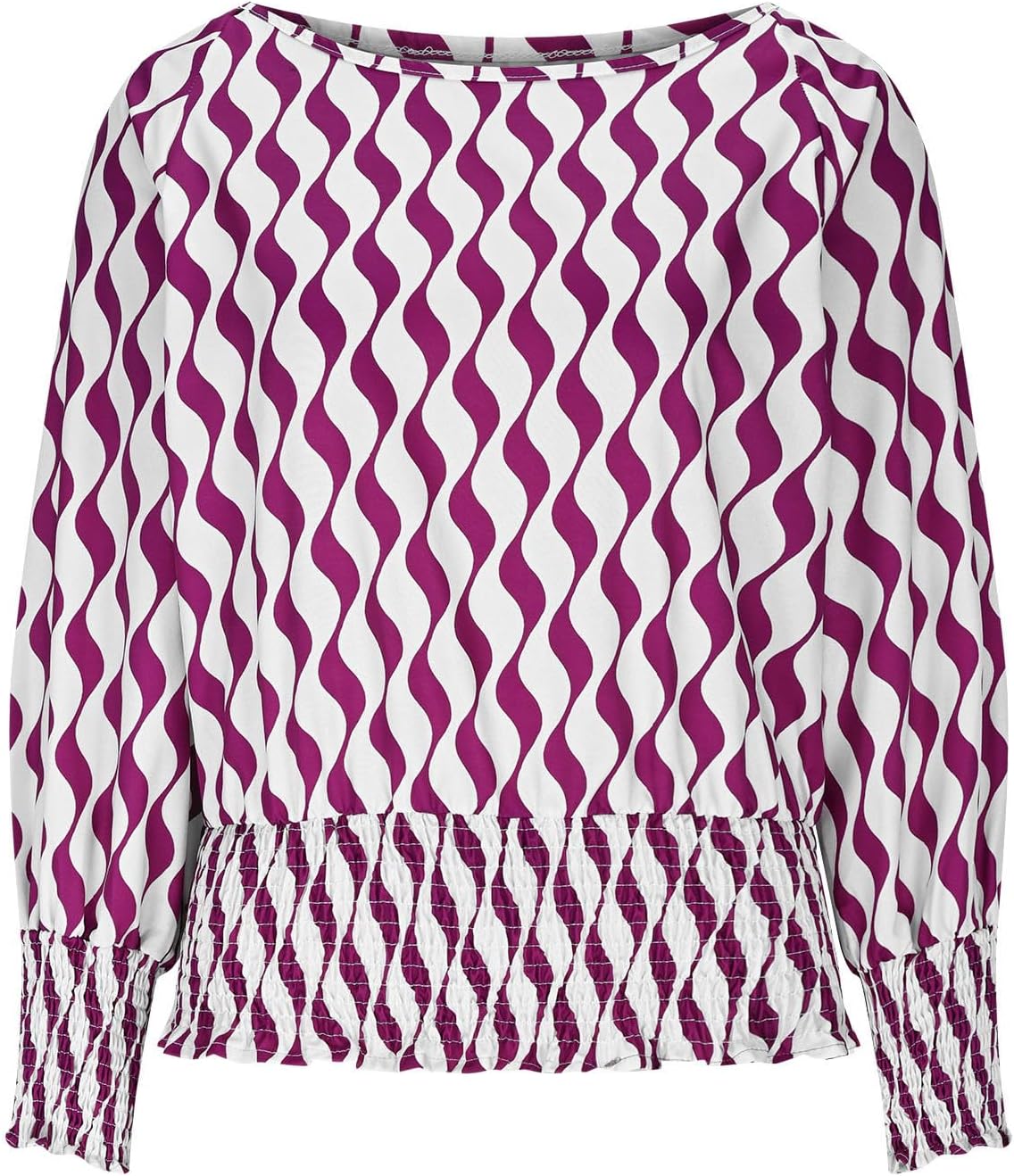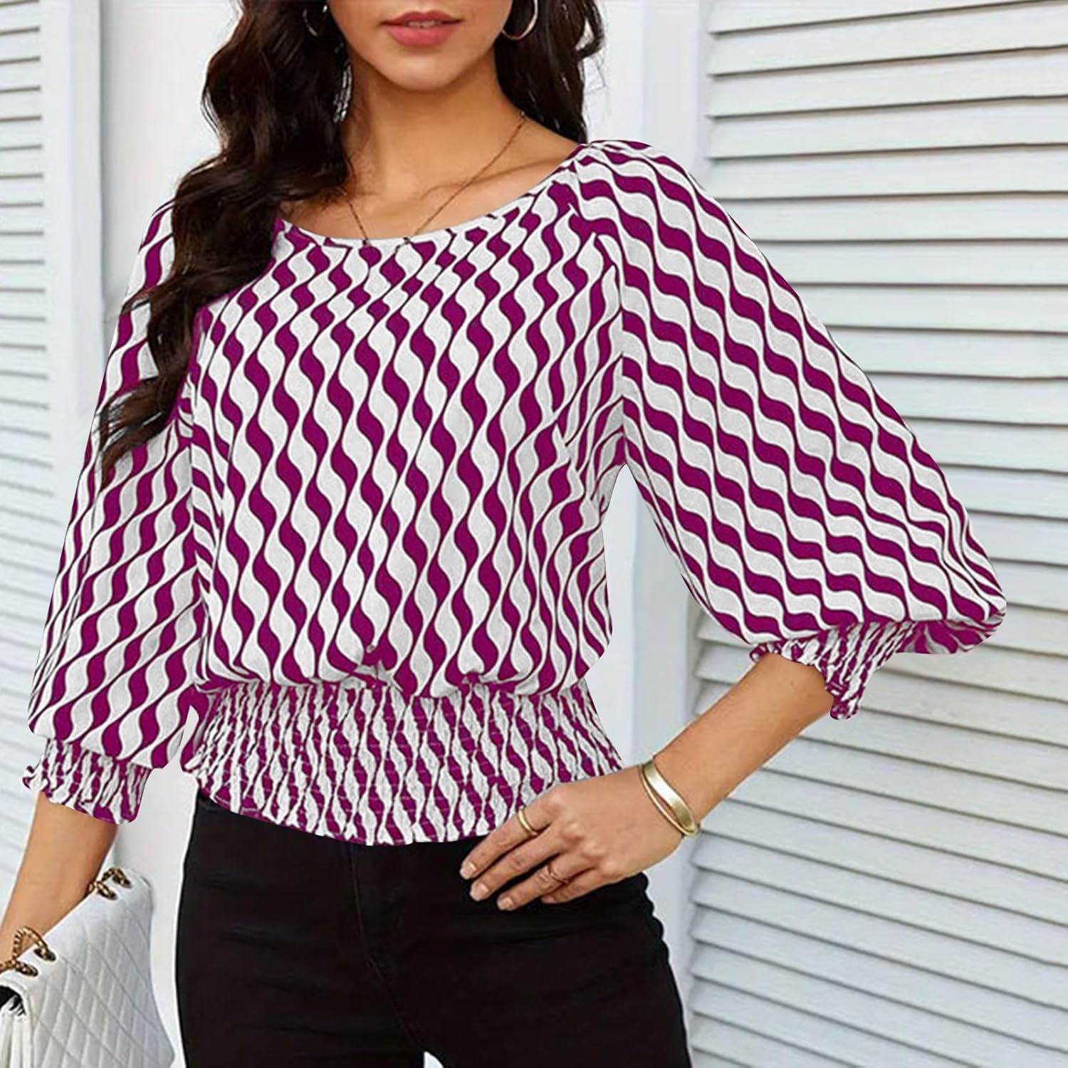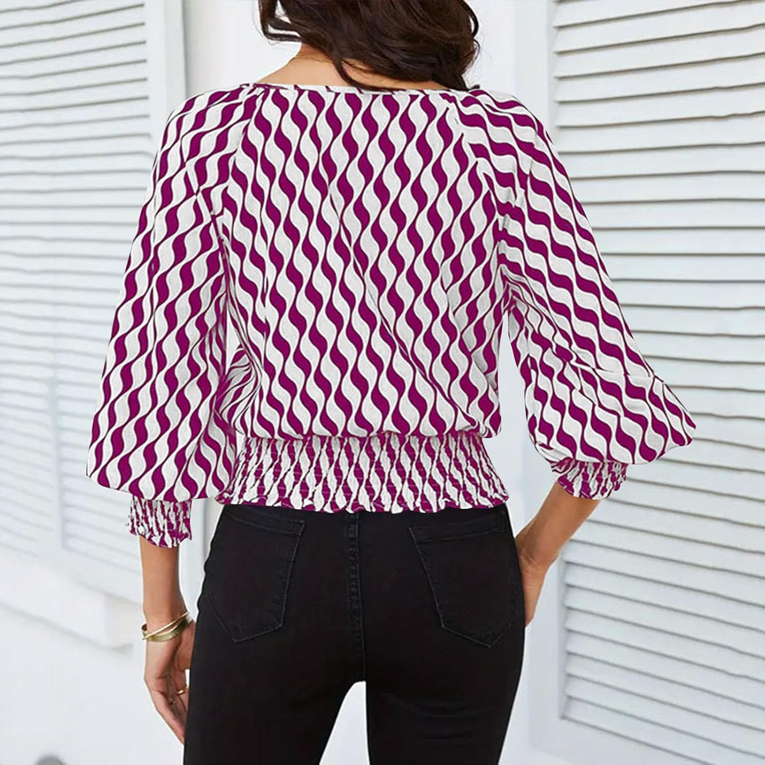 Trendy Lantern Sleeves Tops for Women with Cinched Waist Contrasting Color Print Blouse Dressy Elegant T Shirts