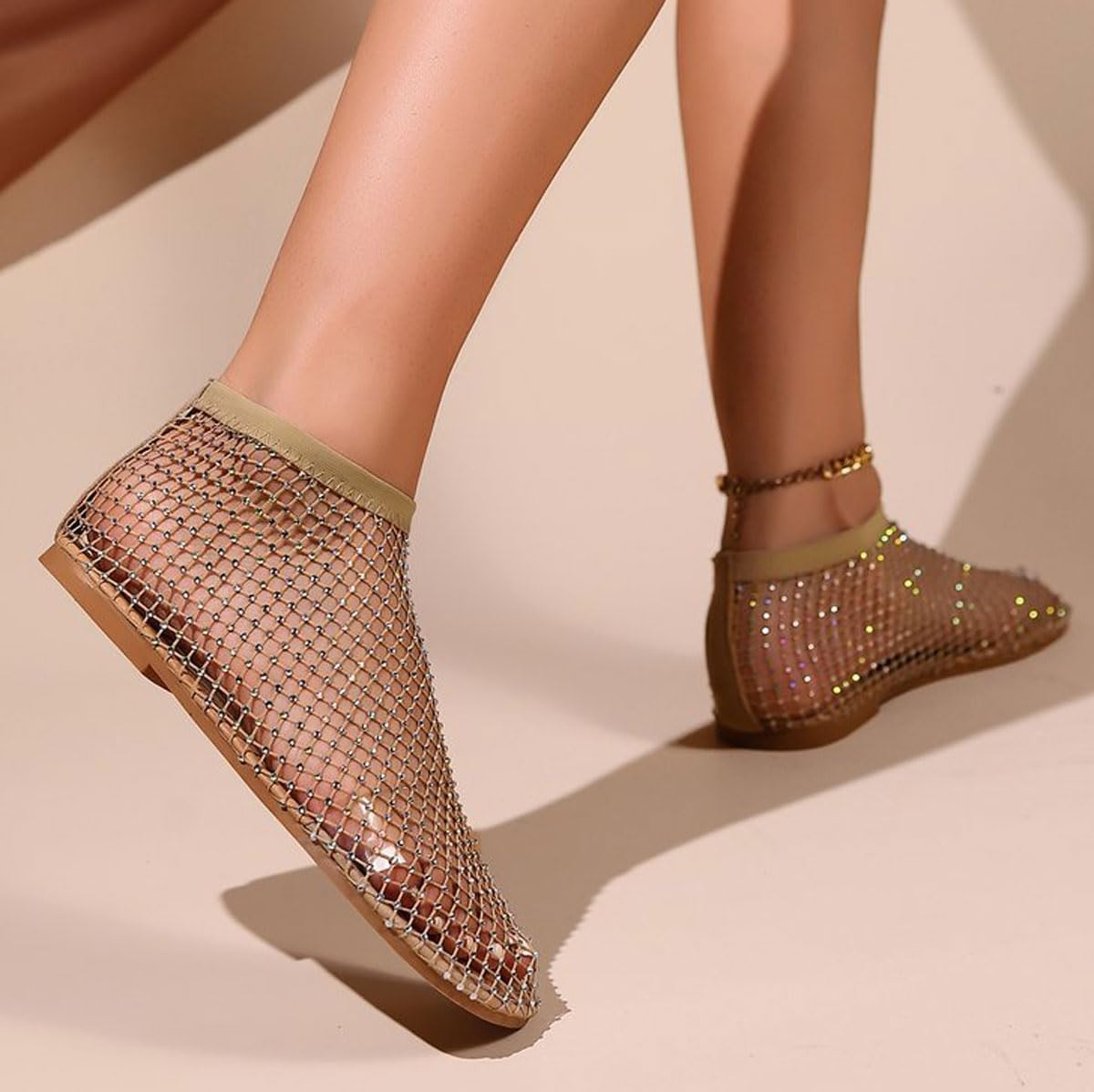 Ultra Comfortable Mesh Flats for Women Fishnet Sandals Low Heel Slip on Rhinestone Shoes