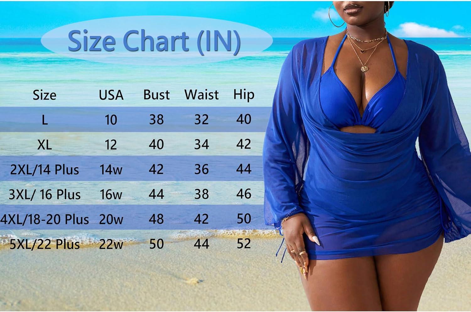 WODECASA Women’s Plus Size 3 Piece Swimsuits Halter Triangle Bikini Set with Drawstring Semi Sheer Cover Up Bathing Suit