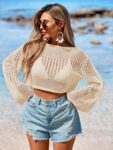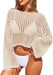Womens Crochet Knit Cropped Beach Top Summer 2025 Off The Shoulder Long Bell Sleeve Bathing Suit Cover Up Tops