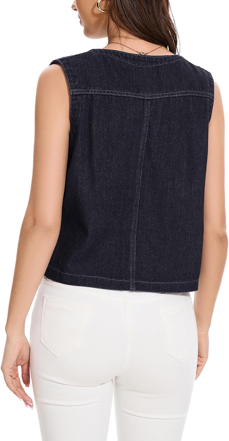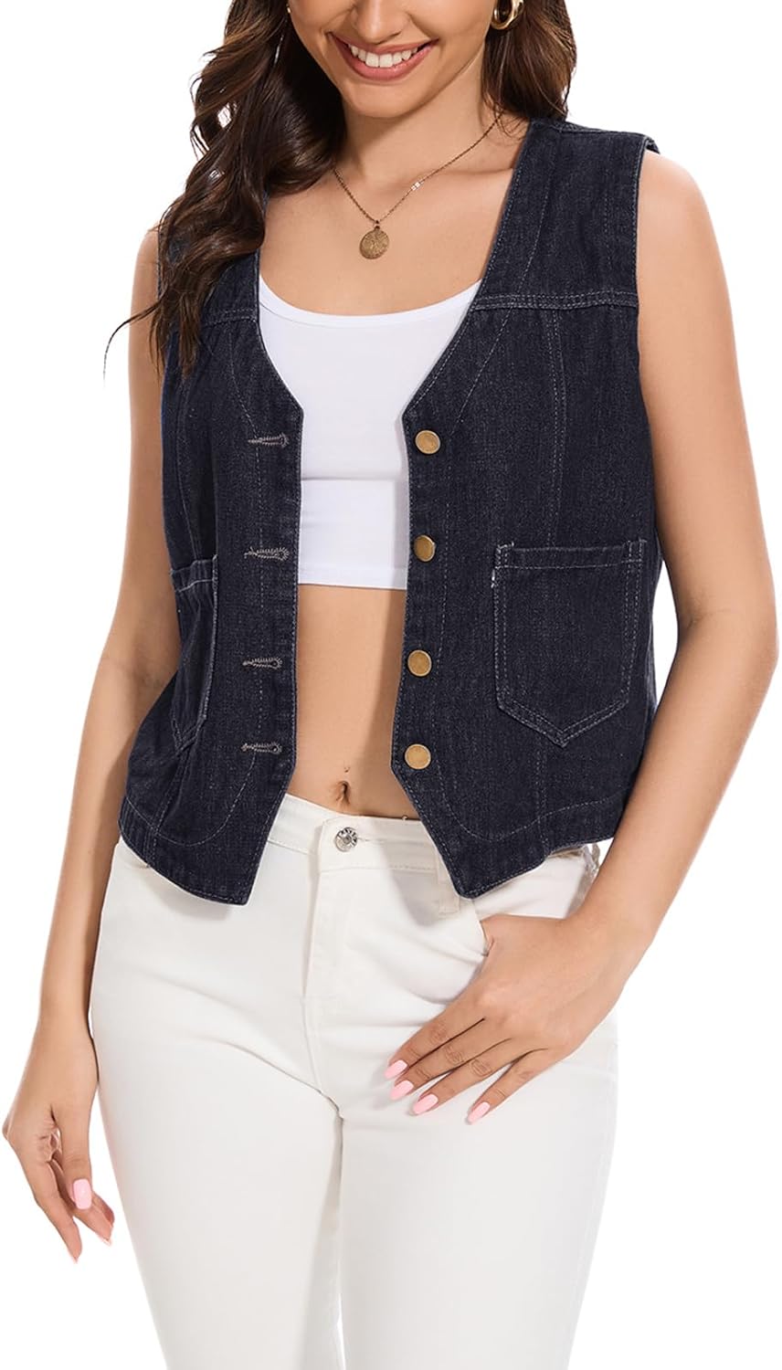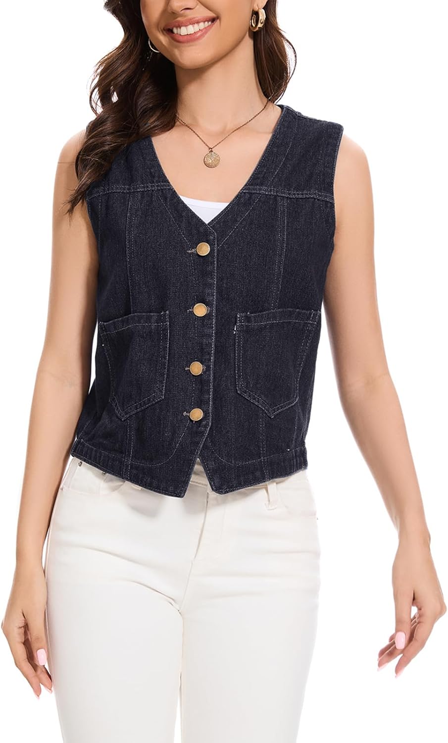 Women’s Denim Jean Vest Tops 2025 Cropped V Neck Button Down Sleeveless Denim Waistcoat Jacket
