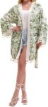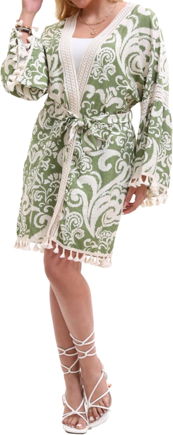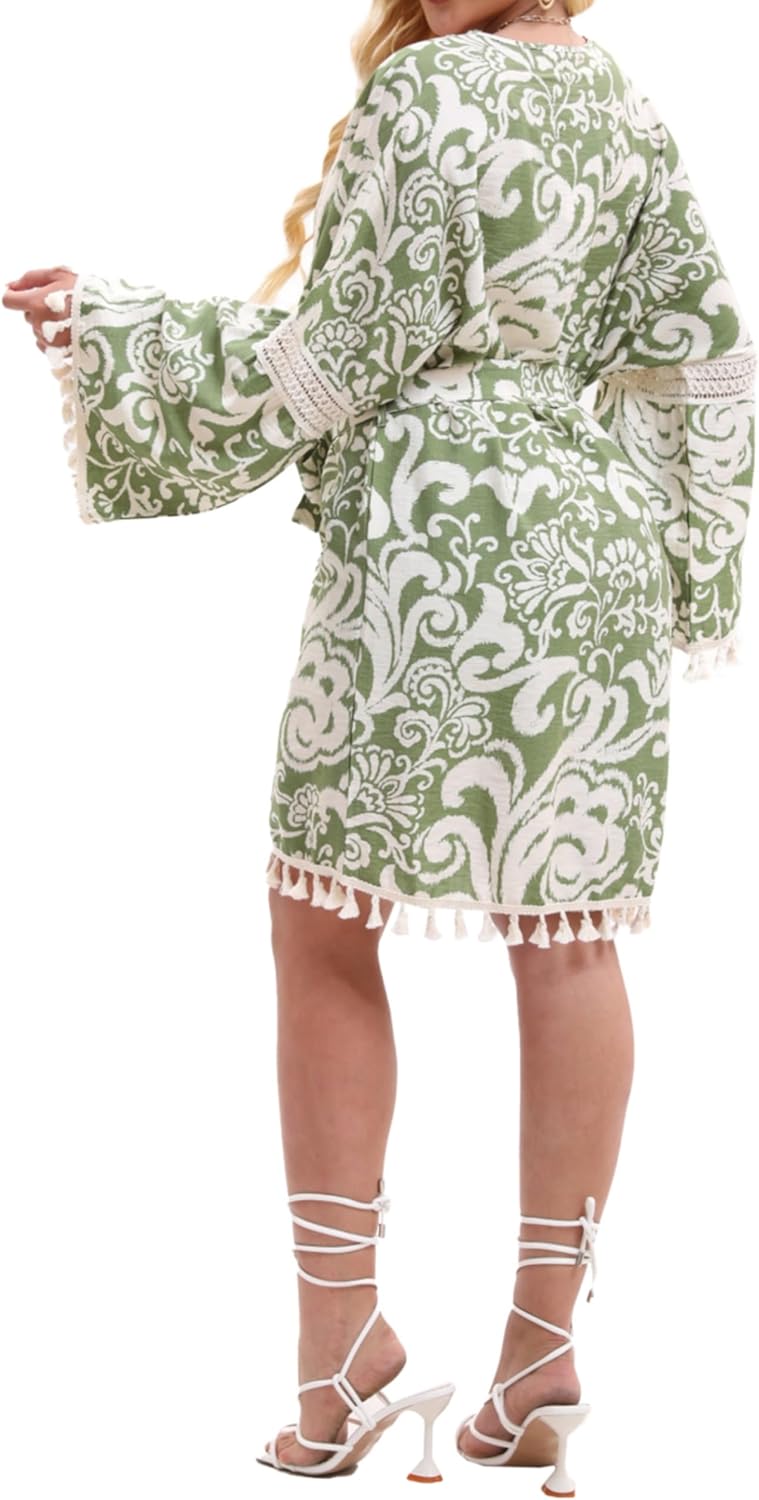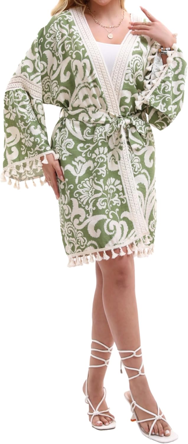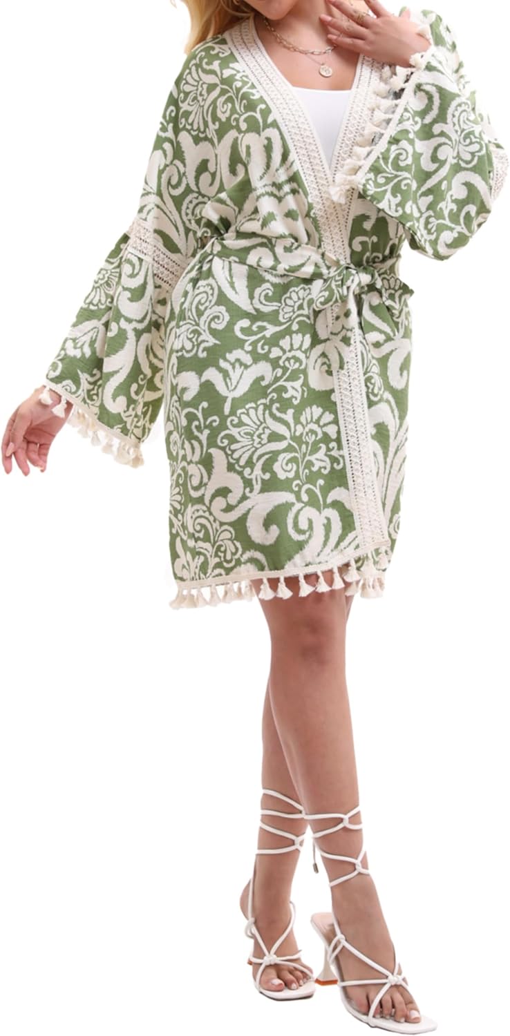 Women’s Lightweight Summer Swimsuit Cover Up Floral Boho Beach Cardigan with Tassels Swimwear Wrap Poolside Outfit