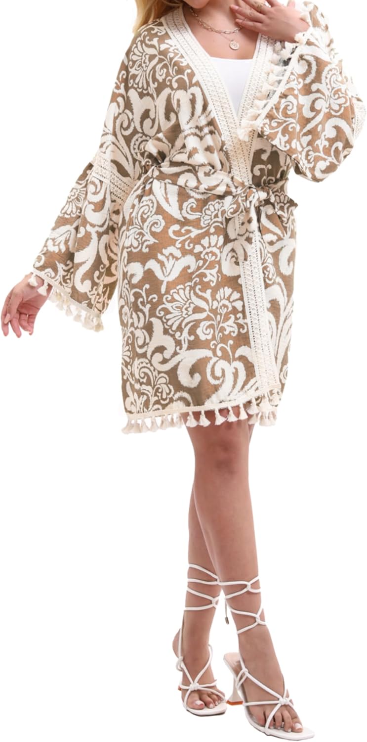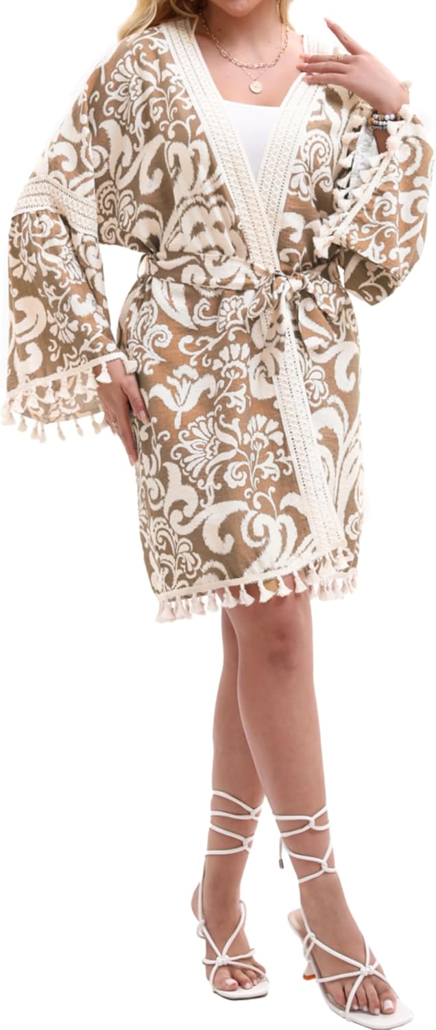 Women’s Lightweight Summer Swimsuit Cover Up Floral Boho Beach Cardigan with Tassels Swimwear Wrap Poolside Outfit