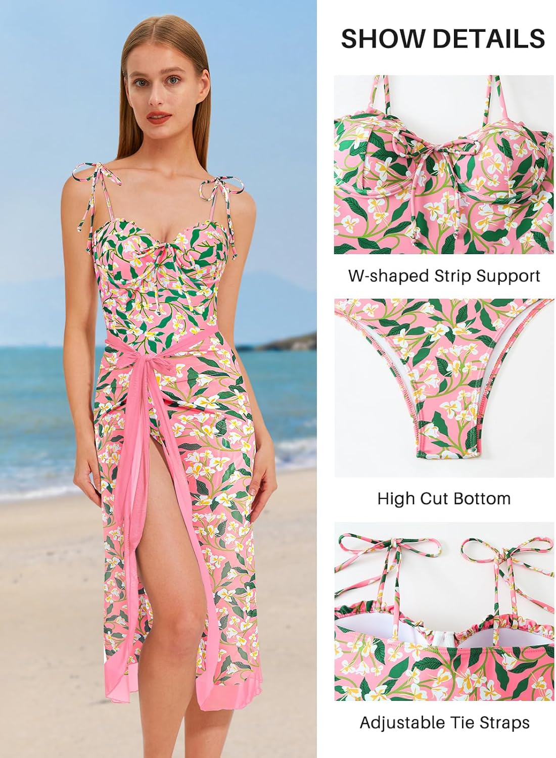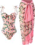 Womens One Piece Swimsuit with Cover Up Sarong Wrap Bathing Suits for Women Modest Swim Suits with Cover Up Set Retro Swimwear Slimming Two Piece Swimsuits Pink Leaf X-Large