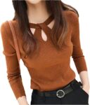 Women’s Round Neck Stretch Pullover Sweater, Hollow Solid Color Slim Bottoming Sweater