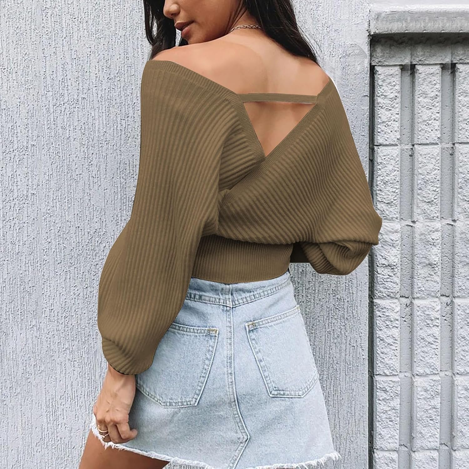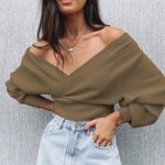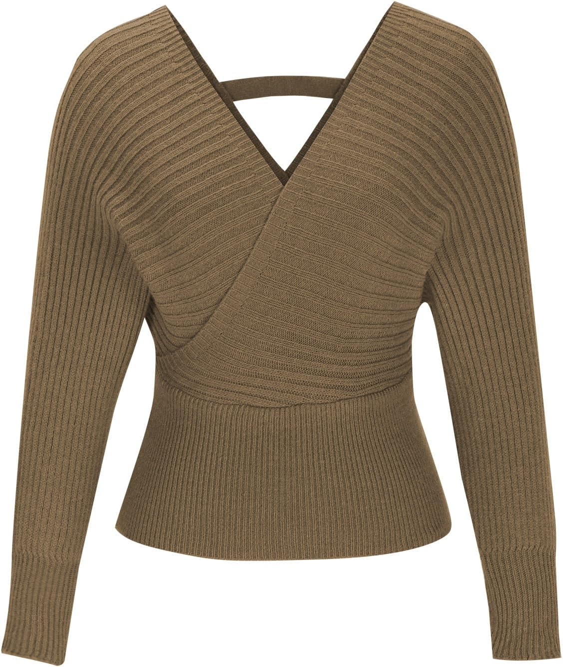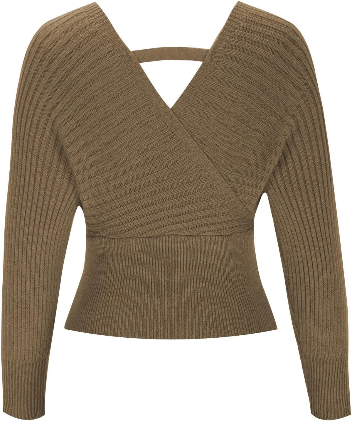 Women’s V Neck Knit Sweater Batwing Long Sleeve Ribbed Cropped Tops Wrap Surplice Solid Casual Pullover Jumper