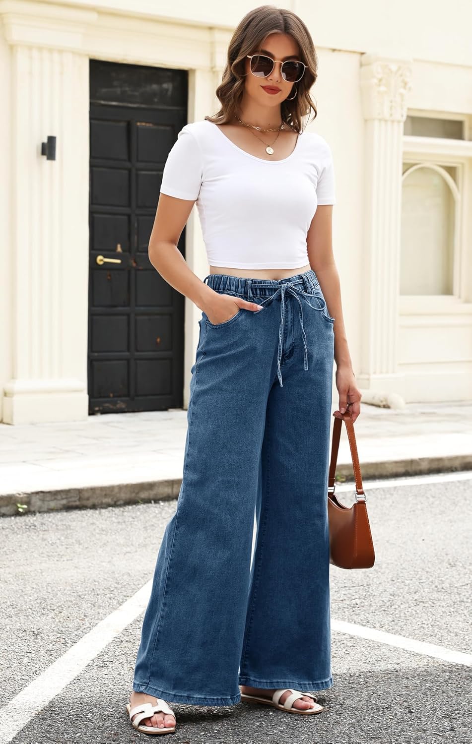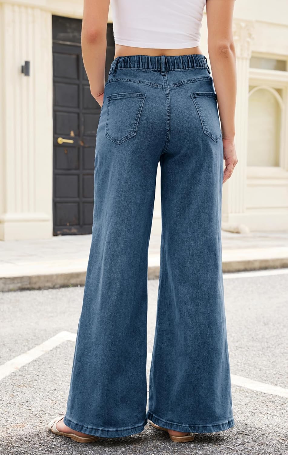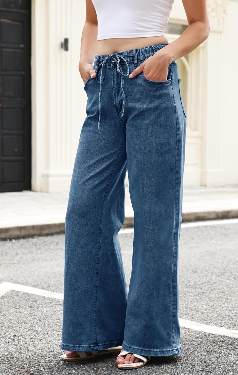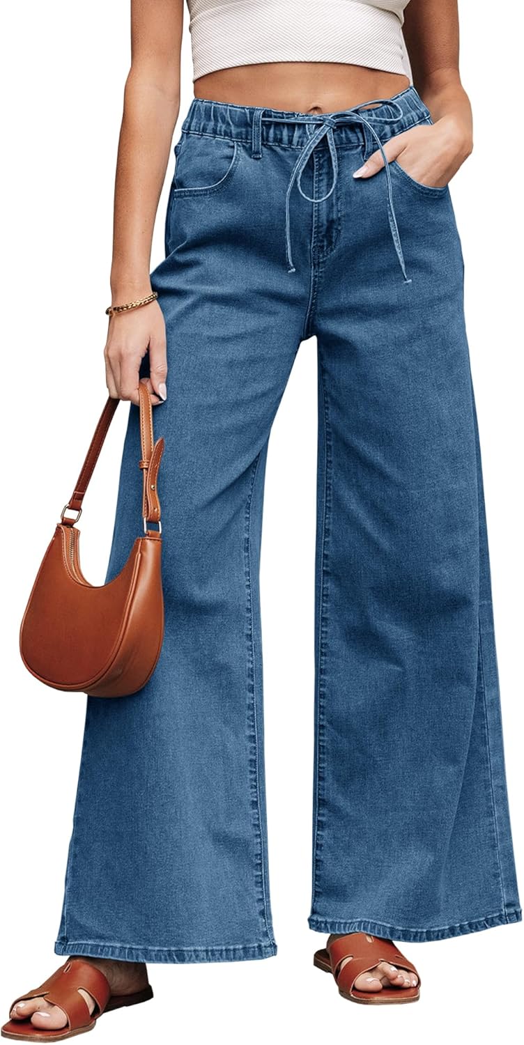 Women’s Wide Leg Jeans Trendy High Waisted Stretchy Jeans with Drawstring Elastic Waist Denim Pants