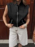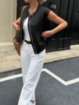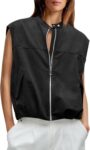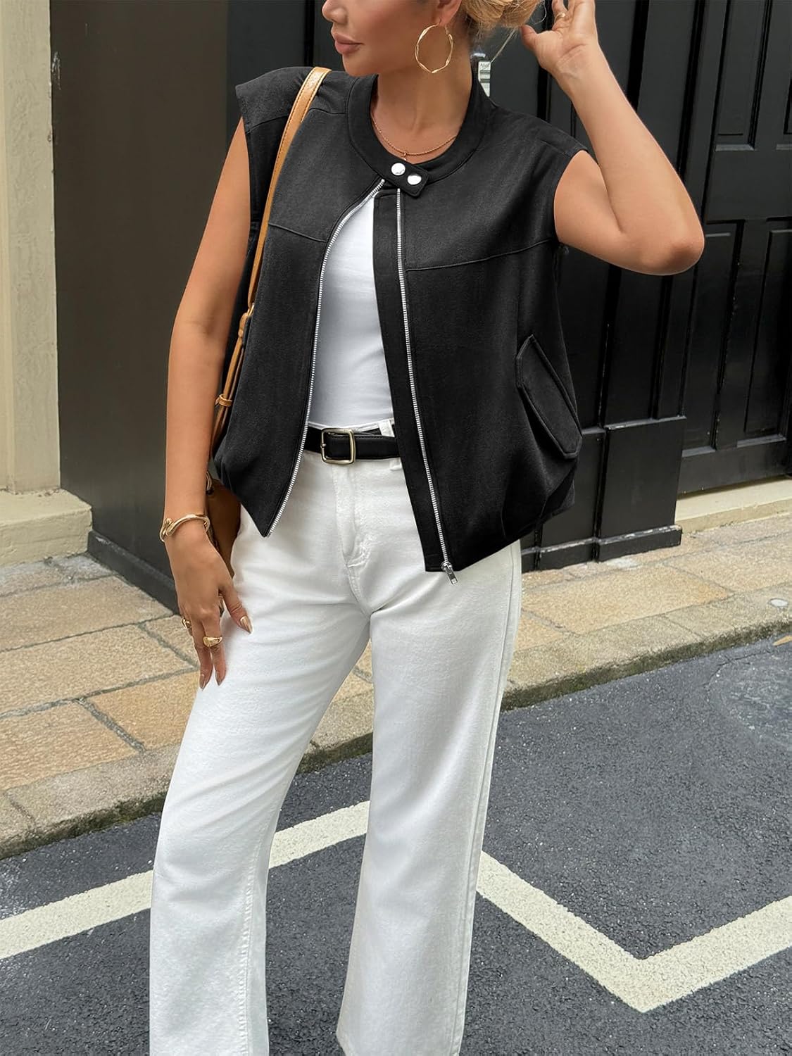 Yousify Womens Zip Up Faux Suede Vest Cropped Cap Sleeve Trendy Casual Pleated Vest Jackets Fall Loose Fit Outerwear